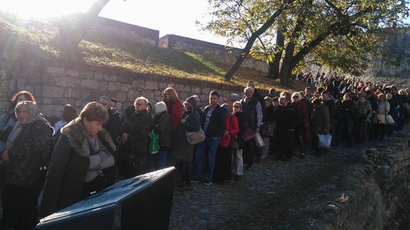 Među posetiocima su i stari i mladi, pa i deca. Žene su ogrnute maramama ovog hladnog jesenjeg jutra i sa dečicom u naručju mladi roditelji čekaju i da ih sveštenik blagosilja.