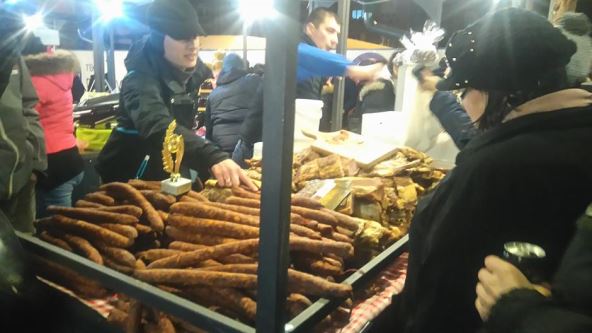Posetioci novogodišnjeg Beogradskog noćnog marketa mogli su, od 18 sati do ponoći, da kupuju domaće proizvode, a najveća gužva je bila oko tezgi na kojima su se prodavali čvarci, "duvan" i oni "obični", ali vrući.