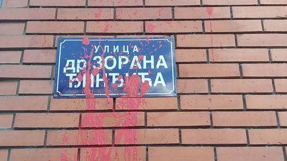Na godišnjicu ubistva premijera Srbije Zorana Đinđića ponovo je neko bacio crvenu fabru preko ulične table koja nosi njegovo ime.