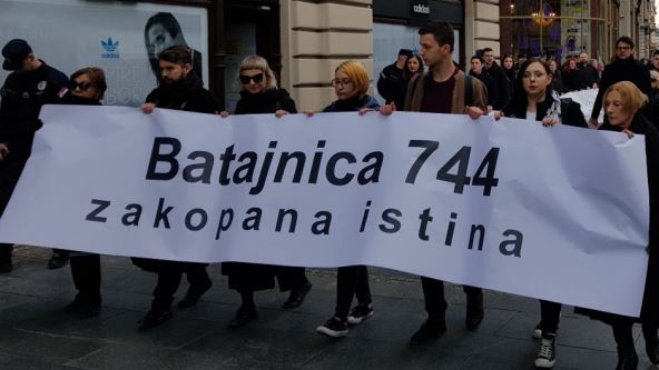 Ovaj transparent odnosi se na slučaj iz 1999. godine kada su u beogradskom naselju Batajnica pokopana 744 tela ubijenih Albanaca sa Kosova, koji su u Beograd doveženi u hladnjači i potom zajedno sahranjeni u masovnoj grobnici.