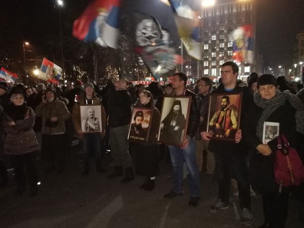 "Srpski narod je izložen progonu koji sprovodi režim Mila Đukanovića, proteruje se srpsko pismo a sada su rešili da otimaju srpske svetinje i to im nikada nećemo dopustiti", poručili su organizatori okupljenima, mahom mladima koji su skandirali "Milo ustašo".