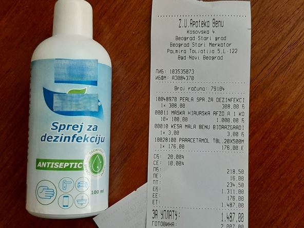 Čitateljka MONDA sa Novog Beograda nam se javila ljuta što je u privatnoj apoteci "Benu" u Starom Merkatoru platila sprej za dezinfekciju od 100 mililitara čak 300 dinara!