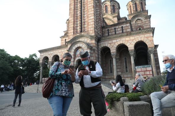Okupljeni ispred Crkve Svetog Marka su pored srpske zastave na skupu nosili i četnička obeležja, odnosno zastavu "Za kralja i otadžbinu" i ikone.