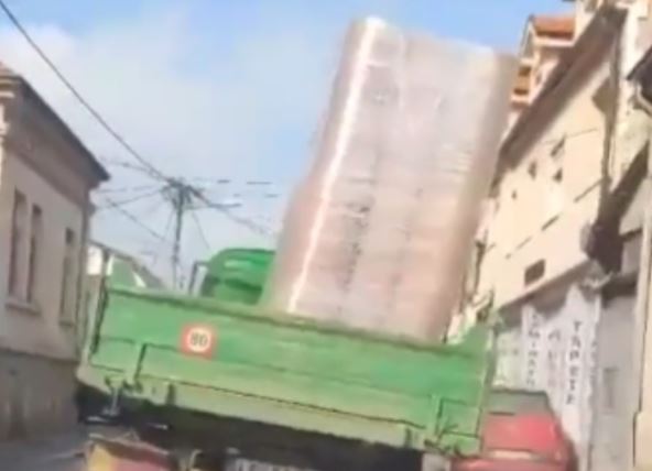 Naime, na snimku se vidi zeleni "TAM" koji prevozi uspravno težak teret crepova u prikolici.