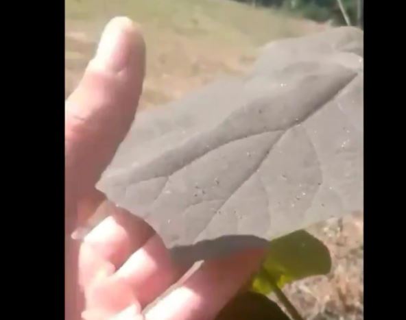 Na snimku se vide tamno sivi umesto zeleni listovi biljaka, a kada osoba sa snimka dodirne biljku sa njenih listova se otresa prašina.