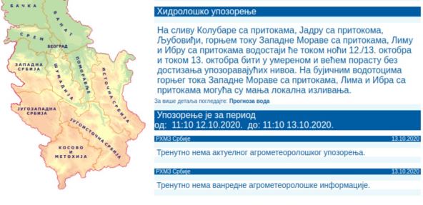 "Na slivu Kolubare sa pritokama, Jadru sa pritokoma, Lјuboviđi, gornjem toku Zapadne Morave sa pritokama, Limu i Ibru sa pritokama vodostaji će tokom noći 12./13. oktobra i tokom 13. oktobra biti u umerenom i većem porastu bez dostizanja upozoravajućih nivoa. Na bujičnim vodotocima gornjeg toka Zapadne Morave sa pritokama, Lima i Ibra sa pritokama moguća su manja lokalna izlivanja".