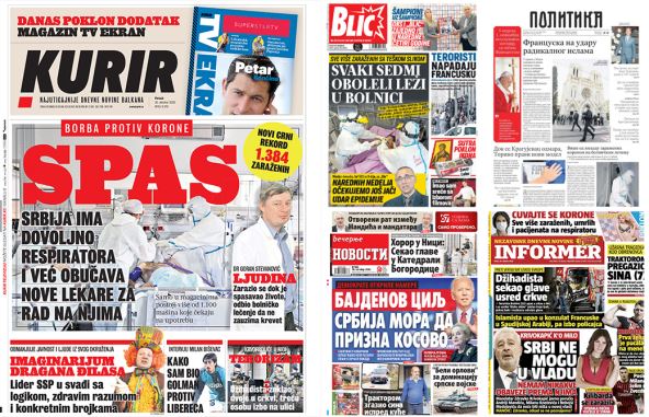 Na naslovnim stranama beogradskih dnevnih listova u petak će u prvom planu biti snažan udar epidemije i veliki broj obolelih. Takođe, tema su i teroristički napadi u Francuskoj, koji su šokirali ceo svet.