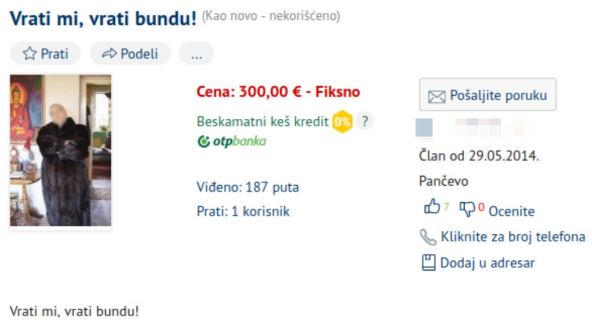 "Odlična bunda od prirodnog krzna, Šapke je visok oko 175, pa računajte za koliku je osobu. Nažalost, ortak sa fotke nije na prodaju, treba mi za neko malterisanje", započeo je ovaj muškarac svoje šaljivo izlaganje, pa nastavio: