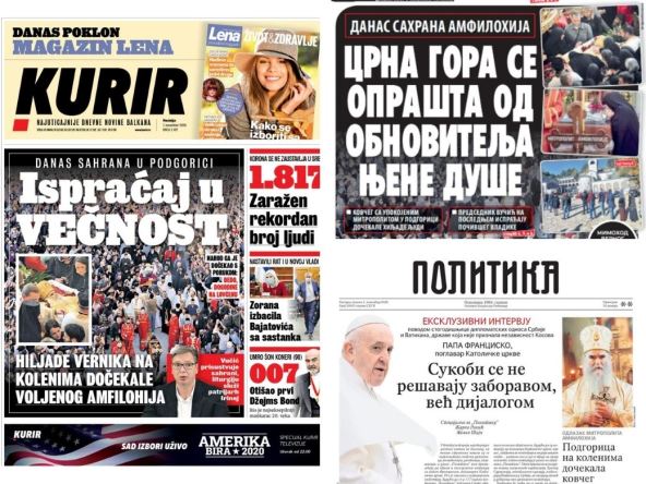 Dnevni listovi u sutrašnjim izdanjima najveću pažnju posvećuju smrti mitropolita Amfilohija Radovića, kao i korona virusa koji se proširio Srbijom, kao i drugim zemljama Evrope.