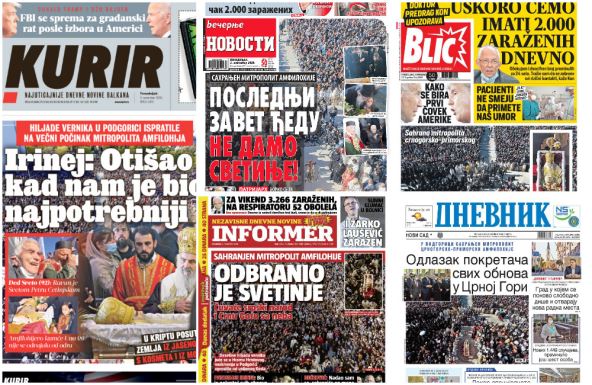 Beogradski dnevni listovi u ponedeljak posvećuju najveću pažnju sahrani mitropolita crnogorsko-primorskog Amfilohija Radovića, uz neizbežnu temu - borbu protiv virusa korona.
