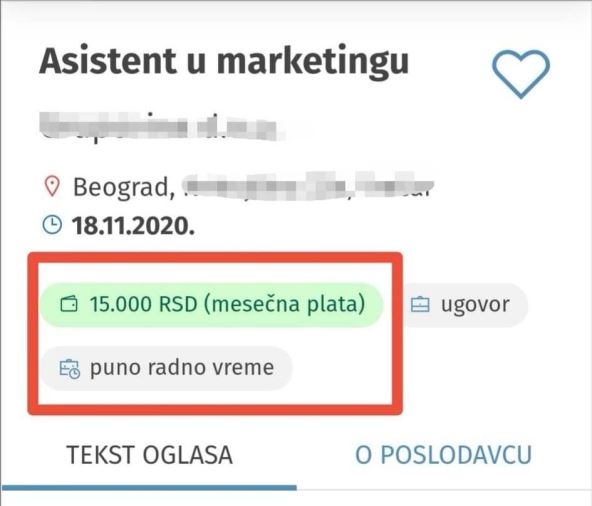 Na internetu se pojavio oglas za posao asistenta u marketingu u kojem piše da mesečna plata iznosi svega 15.000 dinara! Prvo je u oglasu navedeno da ta plata podrazumeva da radnik radi puno radno vreme pod ugovorom, pa je nakon nekog vremena ovo izmenjeno i napisano je da je posao honoraran i podrazumeva klizno radno vreme.