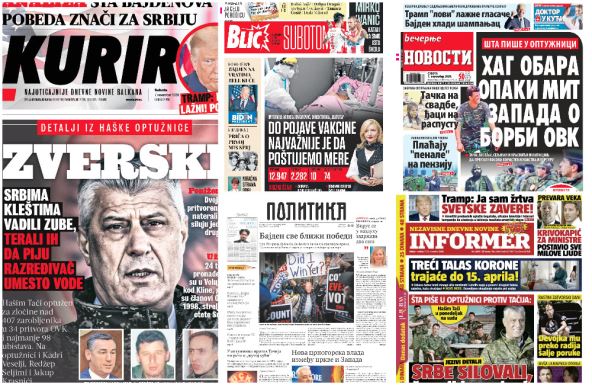 Prvog dana vikenda, beogradska štampa donosi tekstove o optužnici protiv bivših lidera "OVK" na čelu sa Hašimom Tačijem, o merama sa suzbijanje širenja korone u Srbiji, kao i o izborima u Americi.
