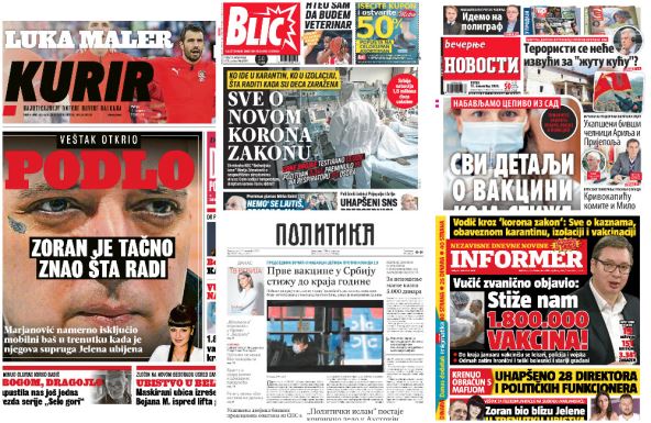 Beogradski listovi u petak donose tekstove o nabavci vakcine protiv korone, o suđenju za ubistvo pevačice Jelene Marjanović i o hapšenju predsednika opština u Srbiji zbog optužbi za korupciju.