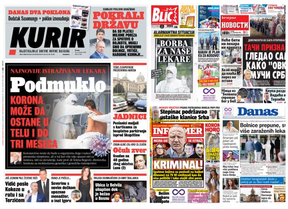 Dnevni listovi u Srbiji u izdanjima od srede najviše pišu o sve većem broju novozaraženih kovidom, ali i o sve više pacijenata na respiratorima, o stanju u Srpskoj pravoslavnoj crkvi posle patrijarhove smrti i o istrazi likvidacije na Novom Beogradu.