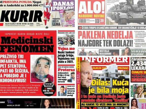 Dnevni listovi u Srbiji na naslovnim stranama izdanja od nedelje najviše pažnje posvetili su situaciji sa korona virusom u Srbiji, odlasku Dijega Maradone, kao i proterivanju srpskog ambasadora iz Crne Gore i crnogorskog iz Srbije, a pišu i o drugim aktuelnim društvenim i političkim temama.