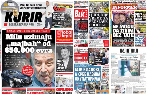 Dnevni listovi u utorak pišu o i dalje jakom udaru korone, o smrti pevača Džeja Ramadanovskog i glumca Tihomira Arsića, kao i o političkoj situaciji u Crnoj Gori.
