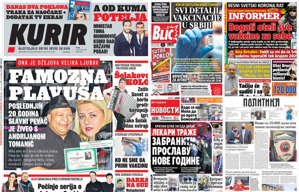 U izdanjima za petak, beogradska štampa piše o vakcini protiv korona virusa koja dolazi u Srbiju, "beloj ženi" koju je voleo Džej Ramadanovski i o drugim temama.