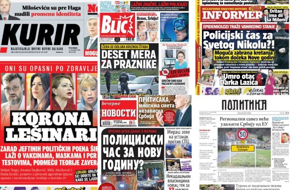 U izdanjima za petak, beogradska štampa piše o potencijalnom uvođenju novih mera za novogodišnje praznike, lopovima koji uz lažne policijske značke pljačkaju domove, novoj ulozi Viktora Troickog u teniskoj reprezentaciji Srbije i o drugim temama.