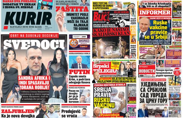 Na naslovnim stranama domaćih novina u petak dominiraju priče o suđenju decenije za ubistvo pevačice Jelene Marjanović u Borči, zatim o nastanku "škaljarskog klana" i o dolasku vakcine u Srbiju.