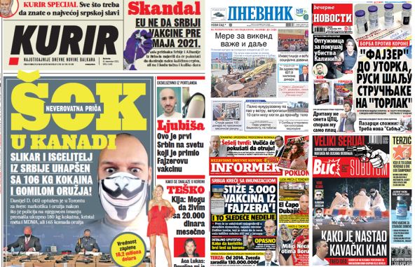 Na naslovnim stranama domaćih izdanja dnevnih novina u subotu istaknute su priče o vakcinama i borbi sa korona virusom u Srbiji, novim merama Kriznog štaba, a piše se i o drugim aktuelnim društvenim i političkim temama.