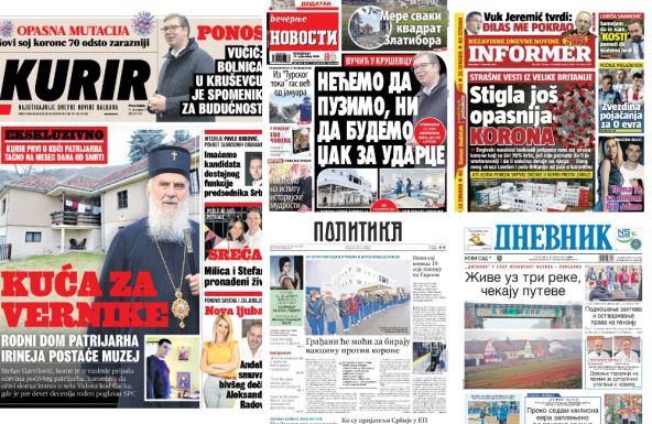 U sutrašnjem izdanju dnevne štampe listovi donose priče o novootvorenoj kovid bolnici u Kruševcu, o vakcini protiv korone i novom soju te bolesti.