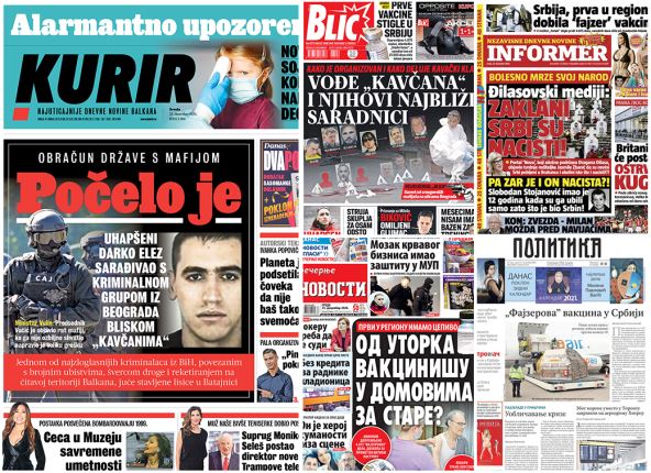 Na naslovnim stranama sutrašnjih izdanja dnevnih listova dominiraju teme o obračunu države sa mafijom, dolasku "Fajzerove" vakcine u Srbiju i najavi početka vakcinisanja.