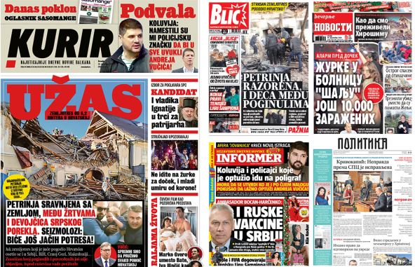 Na naslovnim stranama sutrašnjih izdanja dnevnih novina centralna tema je razoran zemljotres u Hrvatskoj, koji se osetio i širom Srbije. Takođe, najaktuelnije su novosti o zabranama koje će biti na snazi tokom Nove godine.