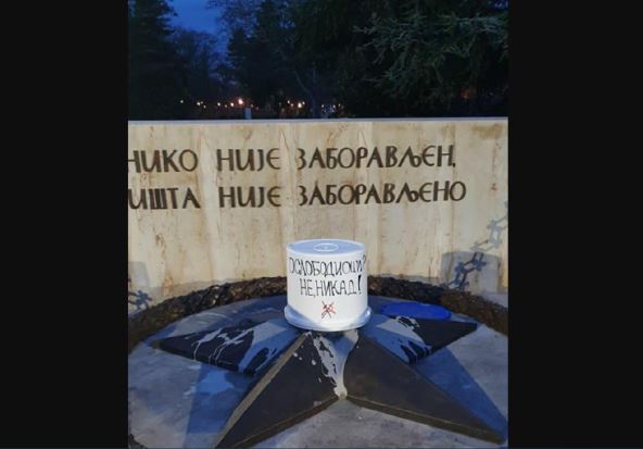Na spomenik su ostavili kutiju od boje s natpisom "Oslobodioci? Ne, nikada!", a ispod toga precrtane srp i čekić.