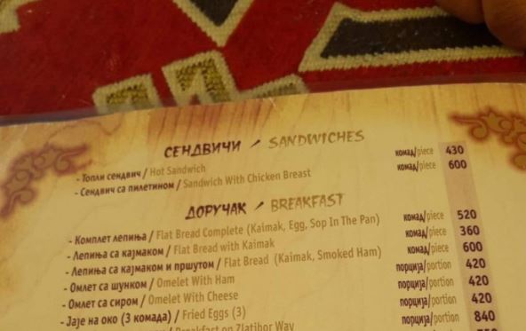 Na meniju vidimo da komplet lepinja košta 520 dinara, ko voli pršut moraće da plati 600, a ljubitelji jaja trebalo bi da izdvoje 420 dinara za tri jaja na oko?!