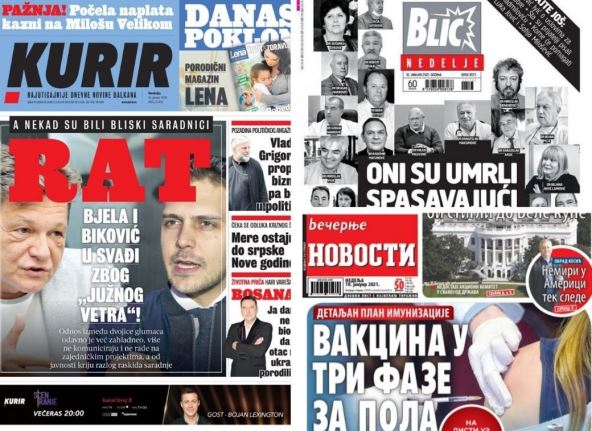 U sutrašnjim izdanjima, dnevni listovi u Srbiji najviše pažnje posvetili su vakcinaciji protiv korone, herojima koji se bore sa pandemijom i drugim aktuelnim političkim i društvenim temama.