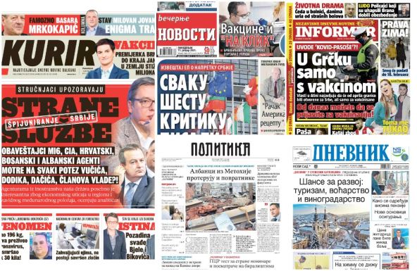 U izdanjima za ponedeljak, beogradska štampa piše o vakcinaciji u Srbiji protiv korona virusa, putovanjima u inostranstvo tokom pandemije, velikim snežnim padavinama u našoj zemlji i drugim temama.
