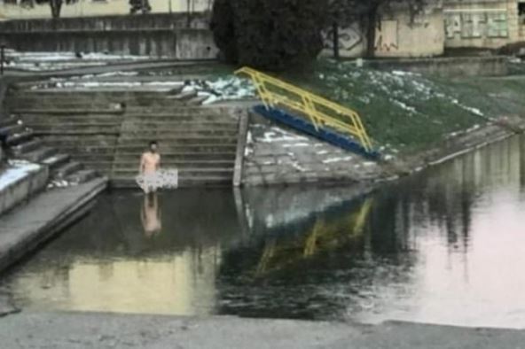 Građane Zrenjanina, koji su se jutros nešto pre osam časova zatekli u centru, na glavnom gradskom trgu, iznenadio je nesvakidašnji prizor, mlađi muškarac, potpuno nag i bos, šetao je, a pre toga je ušao u ledenu vodu jezera ispod malog mosta.