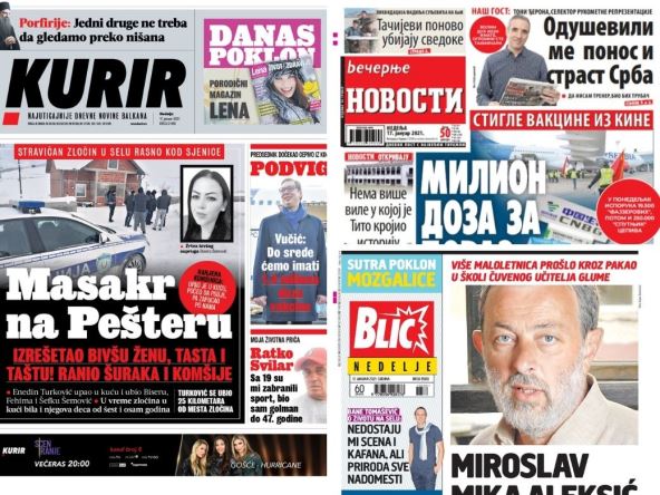 U izdanjima od nedelje, beogradska dnevna štampa najviše piše o masakru na Pešteru, vakcinaciji protiv korone u Srbiji, situaciji u SAD i drugim aktuelnim političkim i društvenim dešavanjima.