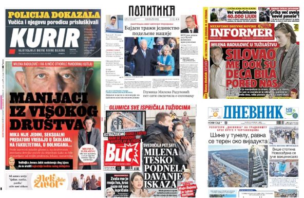 U izdanjima za četvrtak, beogradska dnevna štampa najviše piše o saslušanju glumice Milene Radulović povodom optužbi da ju je silovao profesor glume Miroslav Mika Aleksić, novom predsedniku Amerike Džou Bajdenu, zatim o Đorđu Joksimoviću - čoveku koji je inspirisao film "Otac" i drugim aktuelnim političkim i društvenim dešavanjima.