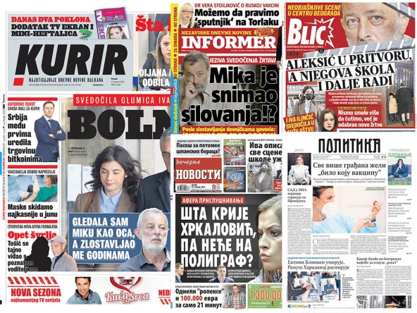 U izdanjima za petak, beogradska dnevna štampa najviše piše o saslušanju mlade glumice Ive Ilinčić koja je podnela tužbu za seksualno napastvovanje protiv Miroslava Mike Aleksića, vakcinaciji građanja Srbije, pljački doma vlasnika pumpe "Knez Petrol" i drugim aktuelnim političkim i društvenim dešavanjima.