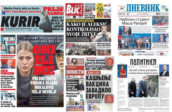Dnevni listovi u Srbiji u izdanjima za petak pišu o procesu vakcinacije u Srbiji protiv korona virusa, kašnjenju vakcina u EU, bivšoj državnoj sekretarki MUP-a Dijani Hrkalović, o slučaju profesora glume Mike Aleksića i drugim aktuelnim političkim i društvenim temama.