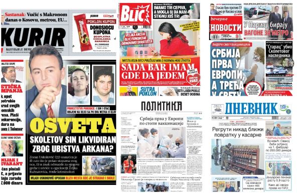 Dnevni listovi u Srbiji u izdanjima za ponedeljak pišu o radnoj poseti predsednika Srbije Aleksandra Vučića Francuskoj i planiranom susretu sa Emanuelom Makronom, nastavku masovne vakcinacije protiv korona virusa u našoj zemlji, slučaju likvidacije sina poznatog kriminalca Zorana Uskokovića u beogradskom naselju Rakovica i drugim aktuelnim političkim i društvenim temama.