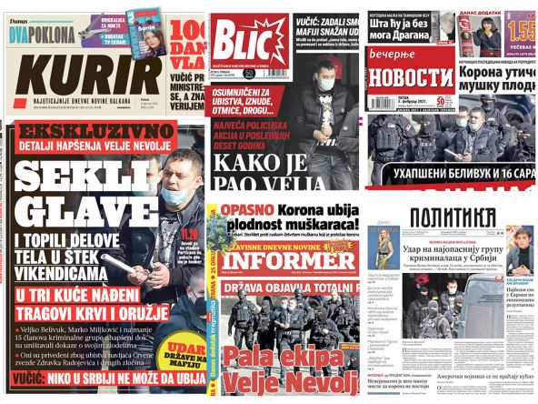 Dnevni listovi u Srbiji na naslovnim stranama izdanja od petka pišu o hapšenju organizovane kriminalne grupe za koju se sumnja da su predvodili Veljko Belivuk, poznatiji kao Velja Nevolja, i Marko Miljković, 100 dana rada Vlade Srbije, izboru novog patrijarha Srpske pravoslavne crkve i drugim aktuelnim političkim i društvenim temama.