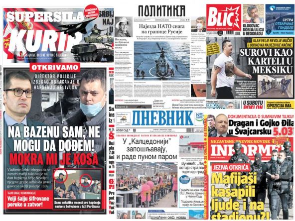 Dnevni listovi u Srbiji na naslovnim stranama izdanja od četvrtka najviše pišu o detaljima zločinačkih dela Veljka Belivuka i njegove kriminalne grupe, ledenom talasu koji stiže u Srbiju, krahu Partizana, ulici u Beogradu koja će nositi naziv Nebojše Glogovca i drugim aktuelnim političkim i društvenim temama.