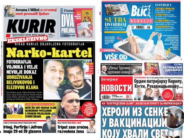 U izdanjima za nedelju, domaći listovi pišu o daljem razvoju slučaja Velje Nevolje, vakcinaciji protiv korone, predstojećim praznicima i drugim temama.