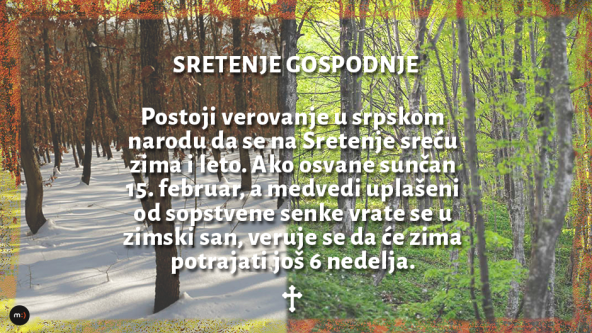 Tako postoji verovanje da se na Sretenje sreću zima i leto. Ako na Sretenje osvane sunčan dan, a medvedi uplašeni od sopstvene senke vrate se u zimski san, veruje se da će zima potrajati još šest nedelja.
