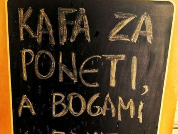 "Kafa za poneti, a bogami i rakija "šalteruša", piše na rekalmnom panou jednog novosadskog kafića koji je nasmejao mnoge.