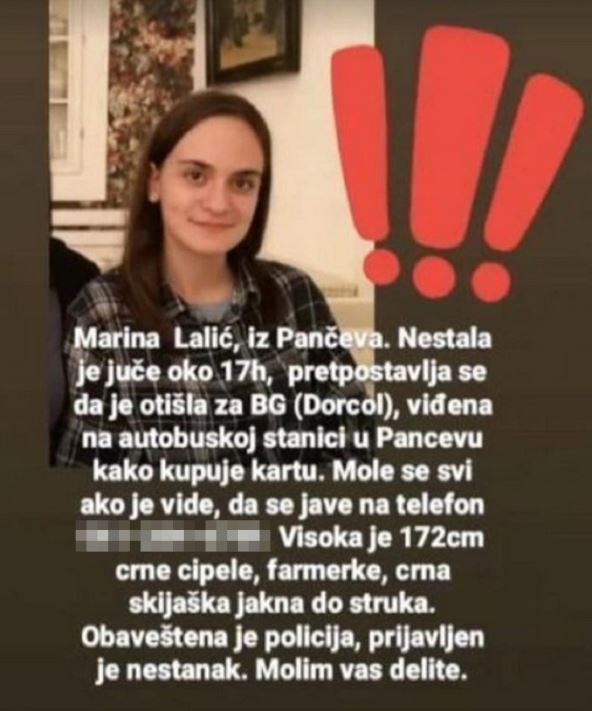 Kako se navodi Marina je nestala juče oko 17 sati, a pretpostavlja se da je bila na putu ka Dorćolu.
