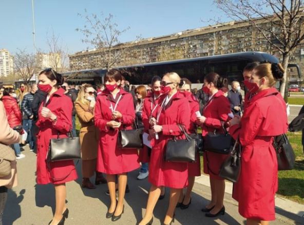 Stjuardese su na vakcinaciju došle u svojim crvenim uniformama sa zaštitnim maskama iste boje.