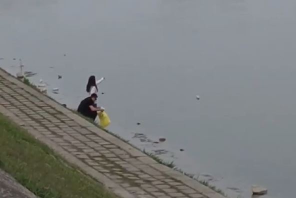 Oni su iz kesa izbacivali jednu po jednu flašu i bacali je u Dunav, u jednom trenutku je mladić možda i primetio da ih snimaju, ali nije mario.