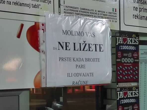 "Molimo vas da ne ližete prste kad brojite pare ili odvajate račune", napisano je na papiru koji je zalepljen iznad šaltera menjačnice.