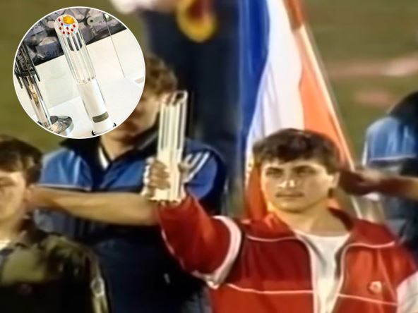 S druge strane, štafeta je bila urađena u obliku kupe, sa osam prstenova, koji su simbolisali republike i pokrajine. Trebalo je da stoji na držaču u kojem se nalazila video-kaseta sa porukom, držač je trebalo da se oslanja na četiri nogice, a čitava kompozicija da stoji na postolju u obliku SFRJ. Ne samo da je bila veoma nezgodna za nošenje, već je zbog te četiri nogiće mnoge podsećala na hoklicu. Svima je neverovatno kako autori nisu završili u zatvoru.
