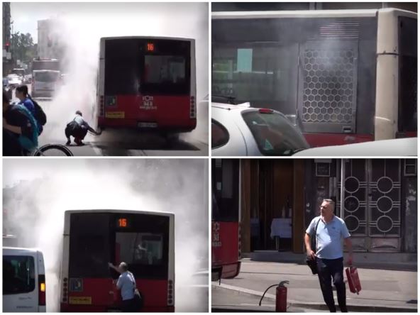 Saobraćaj na uglu Dečanske i Makedonske ulice odvijao se usporeno, a vozač autobusa, uz pomoć kolega, pokušavao je da sanira požar koristeći aparat za gašenje dok je ulje koje je u svakom trenutku moglo da se zapali curilo niz kolovoz.