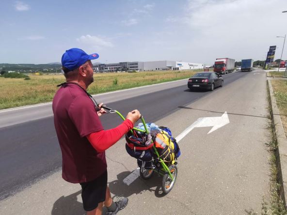 Na ovu dugačku, tešku rutu poneo je lične stvari, šator, punjač za telefon, hranu i sve to vozi ispred sebe na improvizovanim kolicima. Dnevno ponekad prelazi i po 30 kilometara, ali ipak kaže da kroz Srbiju najduže putuje jer ima dosta onih koji ga zaustave, pa pozovu na ručak u da kod njih prespava. Neretki su i oni koji mu nude da ga prevezu do određene lokacije, ali on to kategorički odbija.