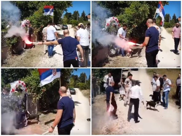 Na snimku sa srpske svadbe mogu se videti svatovi i muzičari koji su došli ispred kuće po mladu.